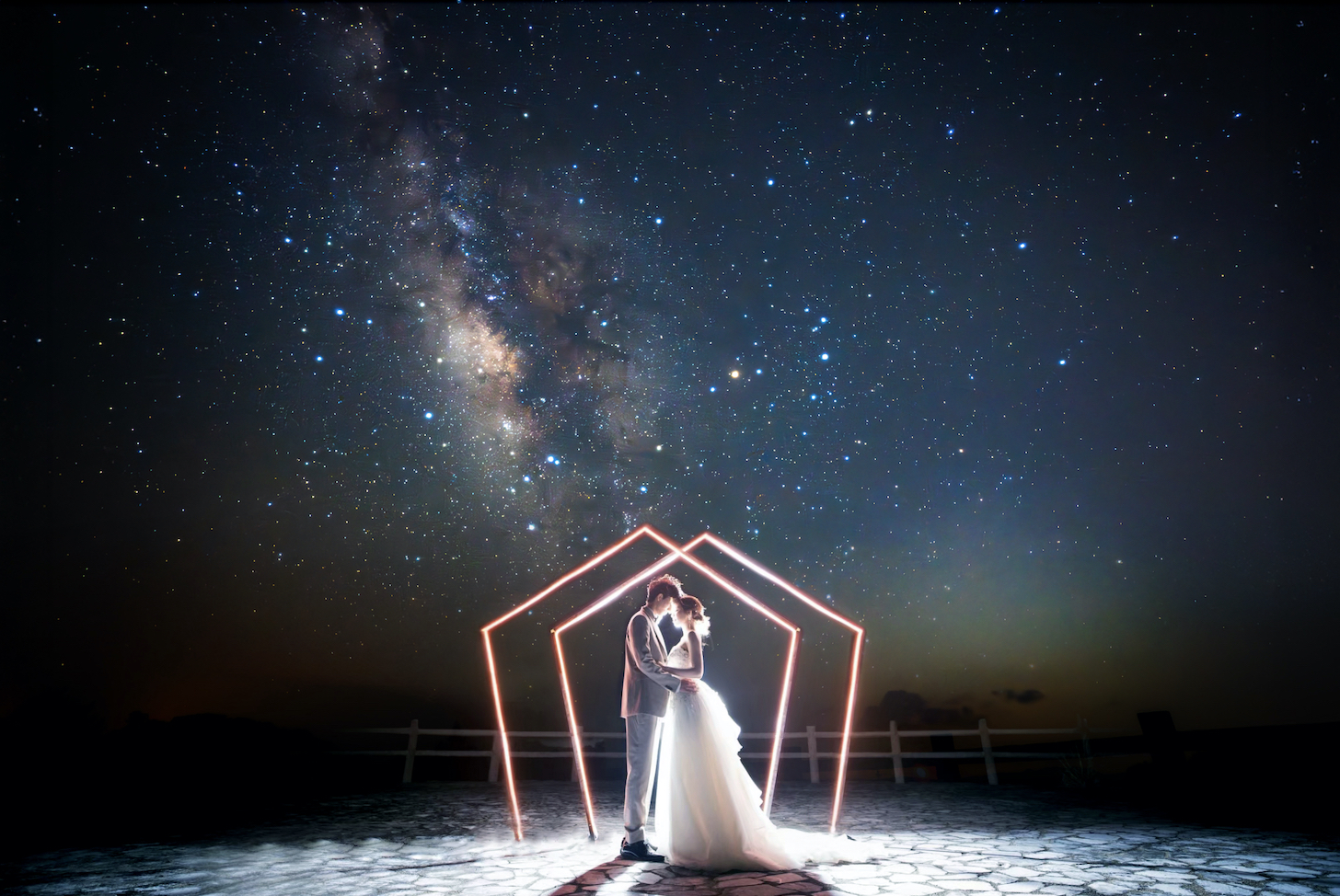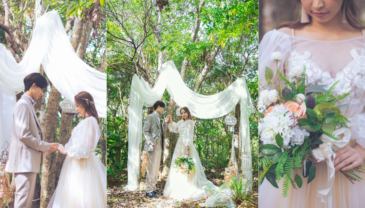 やんばるの大自然が最大の演出です!野鳥のさえずりや四季折々の花木がお二人を祝福してくれます!そして【星空フォト・ウェディング】では!街灯の少ないやんばるでは、 夜空を横切る光の帯が美しく見えます。漆黒の森から聞こえてくるやんばるの生き物の鳴き声をBGMに、満天の美しく幻想的な星空に包まれての貴重な一枚を残しませんか!